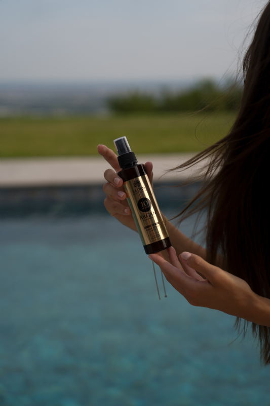 INCI: AQUA/WATER, ARGANIA SPINOSA (ARGAN) SEED OIL, MACADAMIA TERNIFOLIA (MACADAMIA) NUT OIL, OENOTHERA BIENNIS OIL, NIGELLA SATIVA SEED OIL, BUTYROSPERMUM PARKII (SHEA BUTTER) FRUIT, DIMETHICONE, CYCLOPENTASILOXANE, CETEARYL ALCOHOL, GLYCERIN, CYCLOHEXASILOXANE, DIMETHICONOL, CETRIMONIUM CHLORIDE, OCTOCRYLENE, BUTYL METOXYDIBENZOYLMETHANE, PANTHENOL, HYDROLYZED KERATIN, SODIUM HYALURONATE, HYDROLYZED SILK PROTEIN, PHENOXYETHANOL, PARFUM/FRAGRANCE, BENZYL BENZOATE, HEXYL CINNAMAL, BENZYL SALICYLATE, BENZYL ALCOHOL, COUMARIN, AMYL CINNAMAL, CI 16185/RED, CI 47005/YELLOW, CI 42051/BLUE.